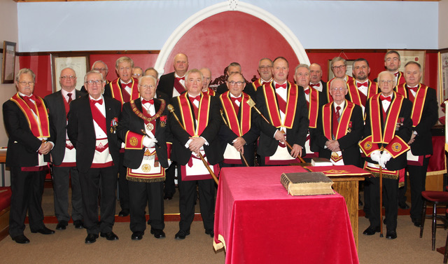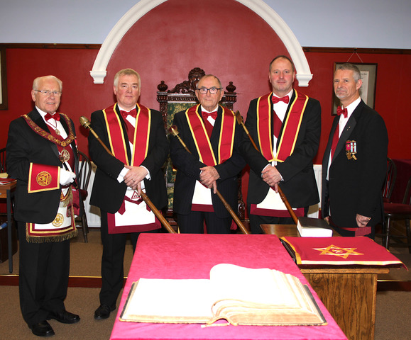 L. to R.: Rt. Ex. Comp. James Lynch District Assistant Grand King, Comp. David Carroll, H.P., New E.K. Ex. Comp. Andrew Spiers, Ex. Comp. Billy Dowds, S.C. and Installing Officer, Ex. Comp. Gordon Keep